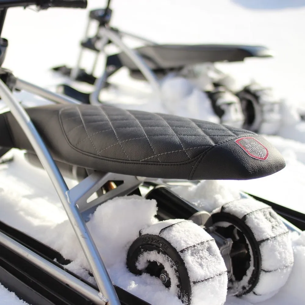 Визуального модный электроснегокат выглядит компактно и эргономично. Общий вес техники сравнительно легкий, составляет 12,7 кг. Конструкция рамы – долговечная и надежная, стальная, не деформируется при эксплуатации в жестких условиях. Большое удобное сиденье покрыто экокожей. Мягкое, повторяет анатомические части тела ездока. Лыжи изготовлены из ударопрочного пластика, гарантируют отличный накат.