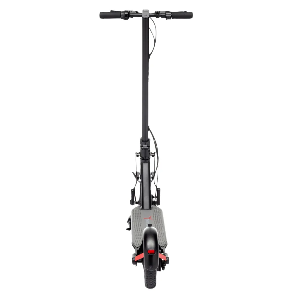 Самокат довольно массивен (23кг), но это позволяет ему быть эффективным при максимальной нагрузке 150кг, а путь до 60 км без подзарядки — очень серьёзный показатель для такого транспорта. Он полноприводный, с прочными колесами, укомплектован надёжными барабанными тормозами, передним фонарём и отражателями на колёсах, стойках и кожухе — производитель позаботился о вашей безопасности в любых ситуациях.