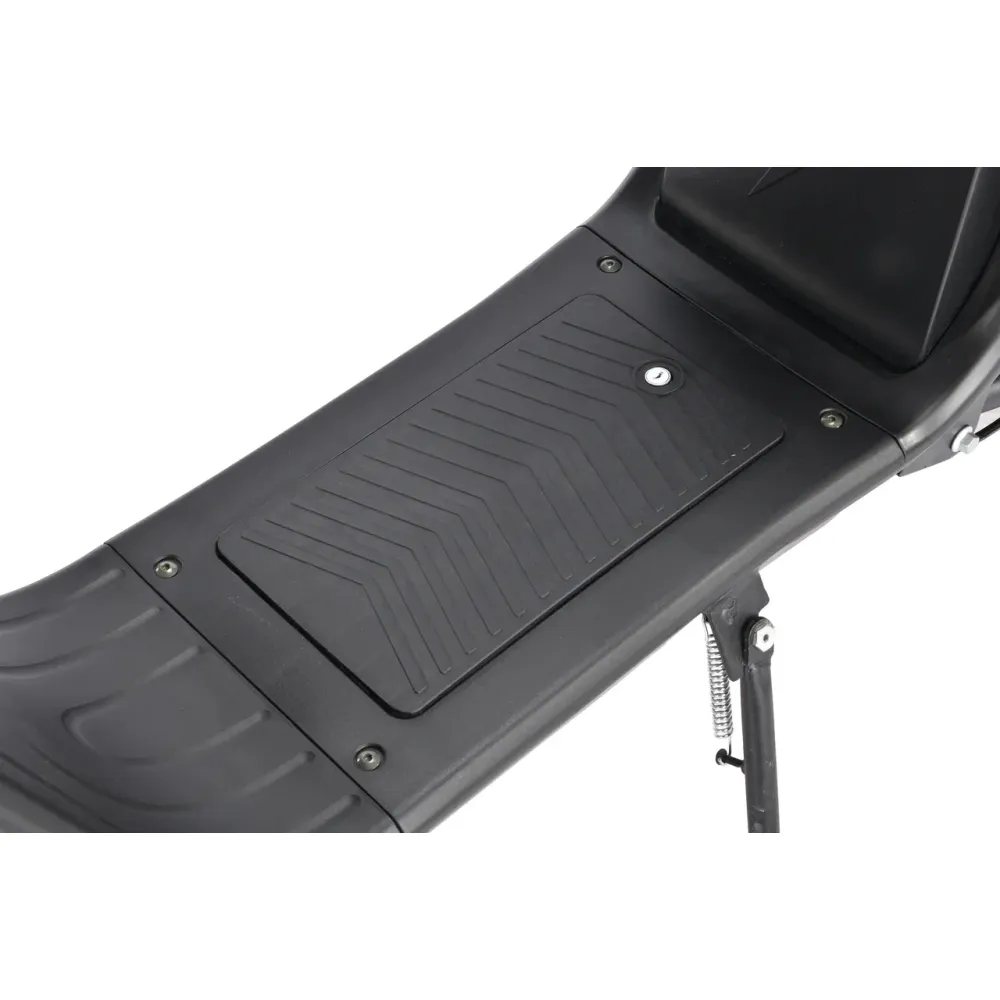 Технические характеристики черного электроскутера представлены такими параметрами: мощность – 2500 Вт, емкость литий-ионного АКБ - 1260 Wh, максимальная скорость – 50 км/час, максимальная продолжительность движения на одной подзарядке. Комфортное двухместное сиденье не утомляет, не вызывает перенапряжение позвоночного столба. Из других преимущественных характеристик стоит выделить прорезиненные ручки, наличие переднего и заднего тормоза, делающими движение безопасным для ездока и техники. При покупке электроскутера клиенты могут рассчитывать на гарантию производителя.