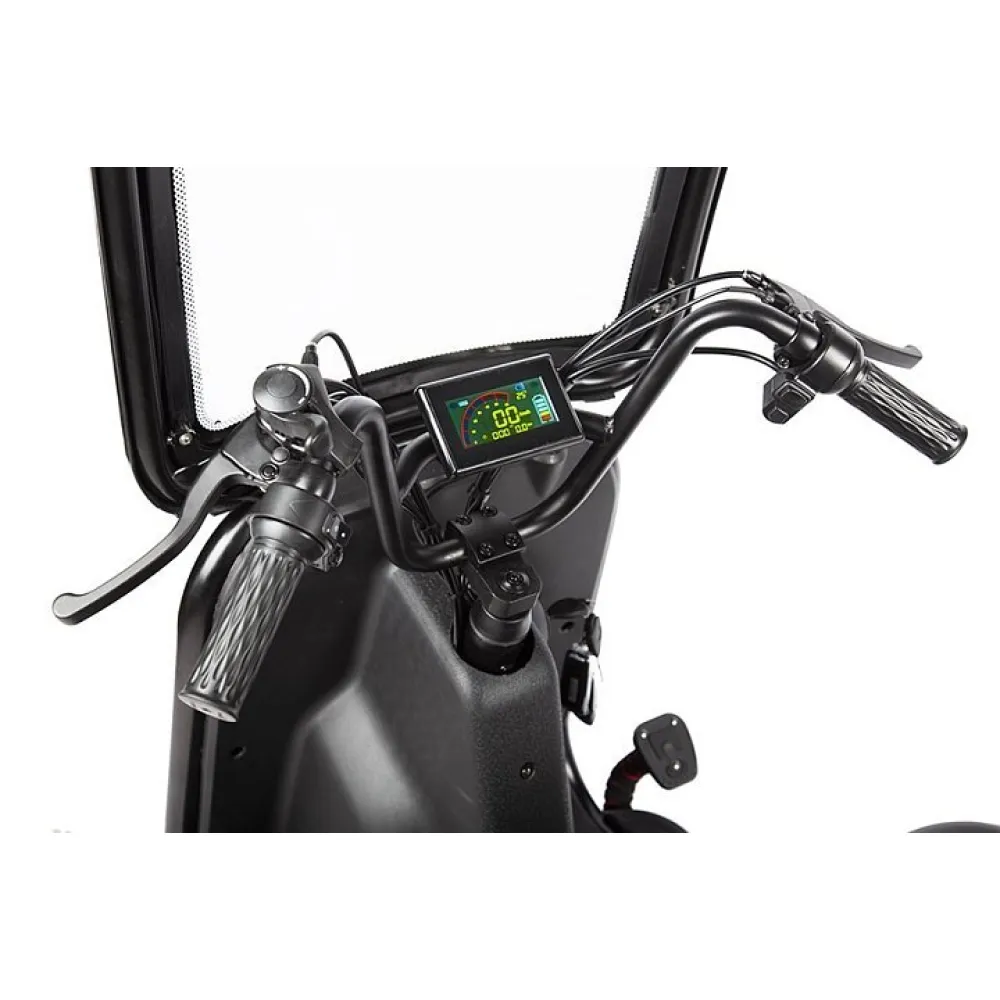 Модель рассчитана на 2-х ездоков, один из которых является пассажиром. Обустроена широкими мягкими сиденьями. Пассажирское оснащено большой спинкой и подлокотниками. При грузоподъемности 120 кг модель может одновременно перевозить взрослого и ребенка. Наличие лобового стекла и крыши повышает уровень комфорта при передвижении при неблагоприятных погодных условиях.