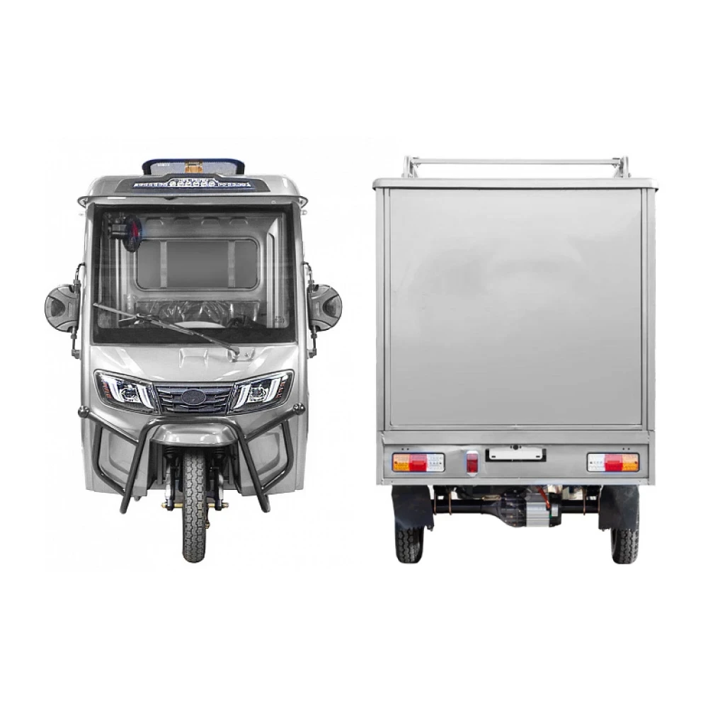 Грузовой электротрицикл Rutrike КАРГО Кабина Дуал серого цвета - это мощное и эффективное транспортное средство, которое предназначено для выполнения самых тяжелых задач перевозки грузов.