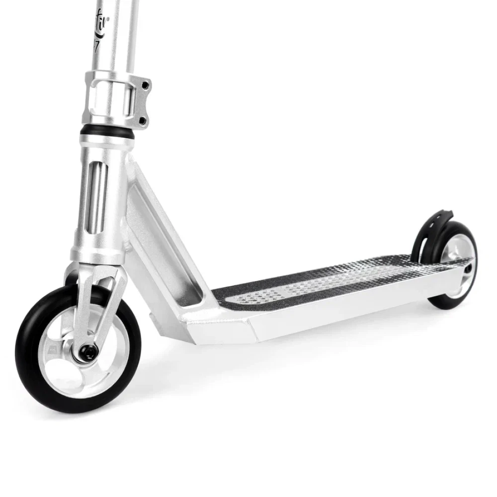 Комплектуется 110-миллиметровыми колесами, которые гарантируют отличное сцепление с поверхностью и плавное передвижение по скейтпаркам и уличным трассам. Черный цвет колес и серый цвет самоката создают неповторимый стиль и выделяют его среди других моделей.