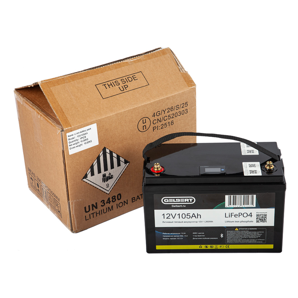 Аккумулятор литиевый тяговый Gelbert LiFePO4 (12V/105Ah/100А/1,260Wh) Bluetooth